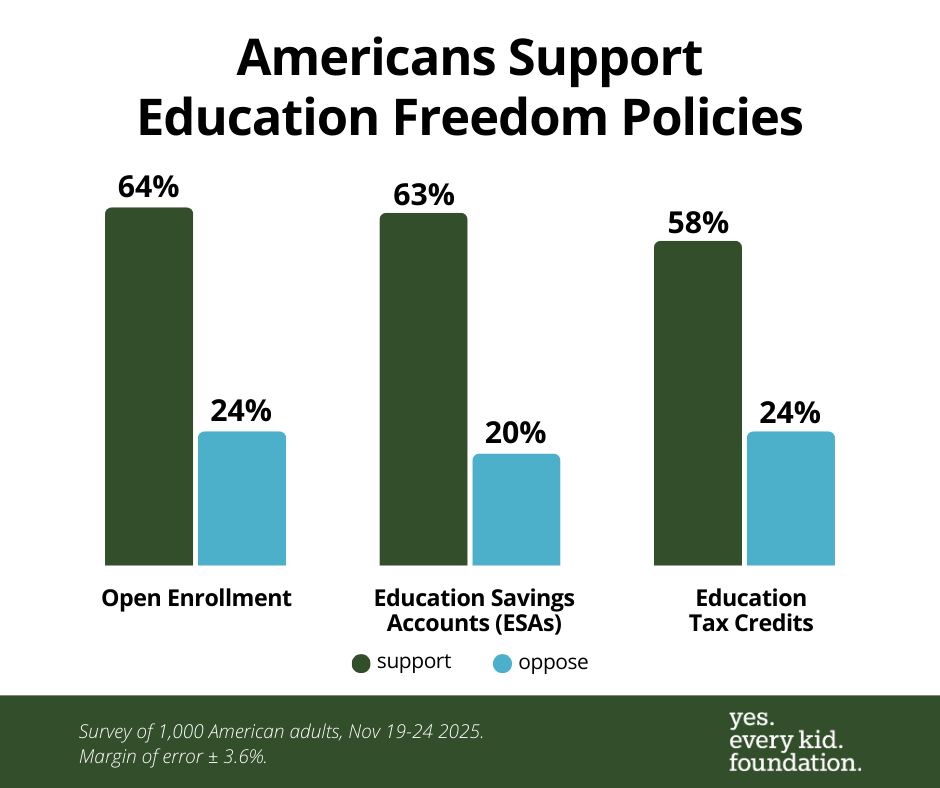 New national polling conducted by YouGov on behalf of yes. every kid. foundation. demonstrates Americans remain firm in their support of expanding education freedom and providing families more opportunities to customize an education to meet the needs of each kid. While special interests continue to try and discredit education freedom in favor of the stagnant status quo, Americans recognize that education decisions should be made by those closest to students, not lawmakers and Washington, DC. Americans also recognize that education freedom policies strengthen education throughout the country.